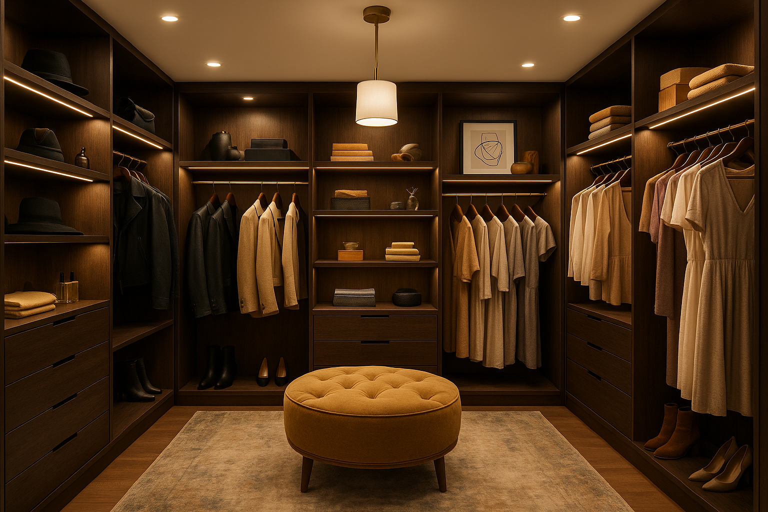 Think about integrating open shelves for your favourite items, drawers for smaller accessories, and plenty of hanging space for dresses and suits. Consider including a stylish ottoman or bench for comfort and convenience. Opt for a mix of lighting options to illuminate your closet and highlight your clothing.